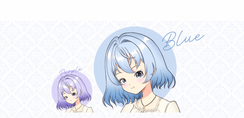 紫色の髪は、神秘的・妖艶・個性的といった印象を強く与えます。これは紫がもともと「高貴さ」や「魔術的な雰囲気」を象徴する色であることに由来します。