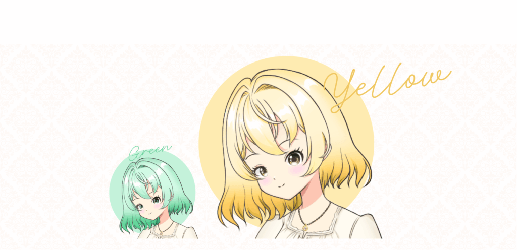 黄色や金髪は、明るさ・華やかさ・高貴さなど、ポジティブな印象を多く持つ髪色です。黄色寄りなら元気で活発、金色寄りなら気品や非日常感を演出できるため、キャラクターの方向性によって幅広く活用できます。